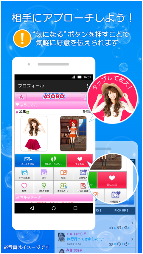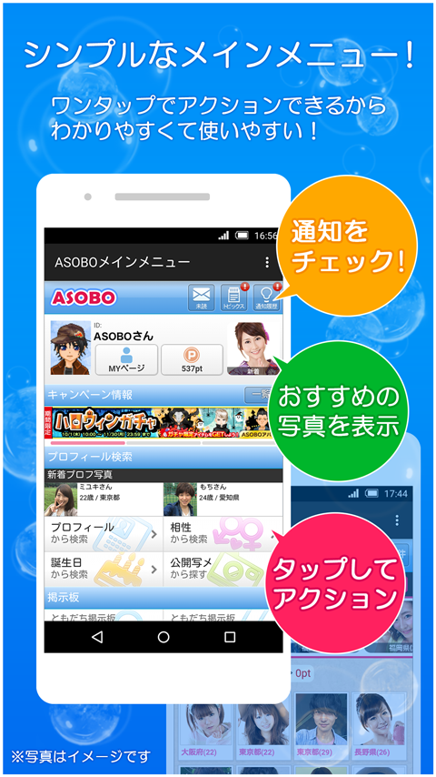 ASOBOの面白いところは、出会いだけではなく日記や写メランキング、アバター、無料ゲームなど長く楽しめるサービスを提供しており、コンプリート欲やランキング欲が強い女性ユーザーに評価をされていて女性がハマるトータルコミュニケーションサイトと言われています。