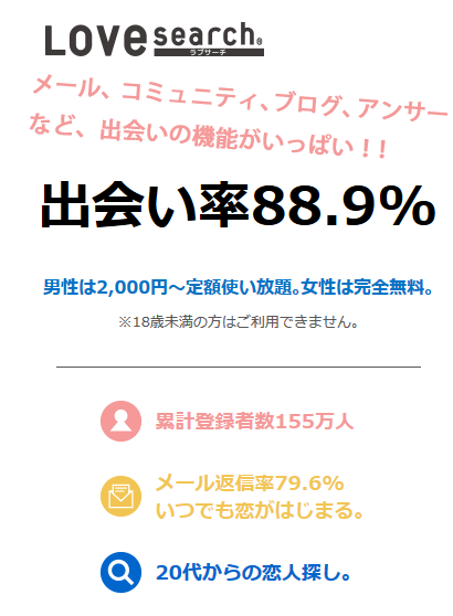 あまり出会い系サイトのことを知らない人達の間では知名度があまり高くないですが、知る人ぞ知る超優良出会いサイトがラブサーチ(Love search)です。