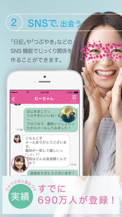 ワクワクメールは、2017年時点では680万人を突破しており、毎日1,500人以上が新規会員登録している日本最大級の出会い系アプリ、サイトです。
